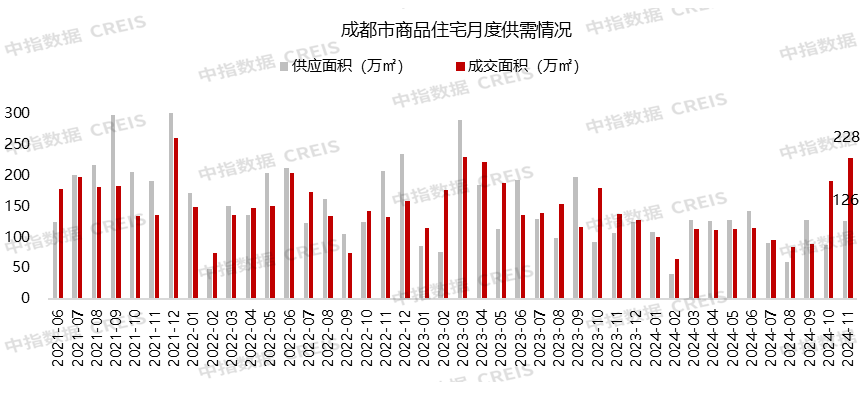 2024年11月,成都市商品住宅供应面积为126万㎡,同比上升18%,环比上升43%。成交面积为228万㎡,同比上升66%,环比上升19%。