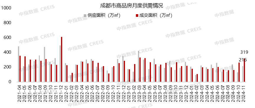 2024年11月,成都市商品房供应面积为216万㎡,同比上升12%,环比上升66%。成交面积为319万㎡,同比上升46%,环比上升22%。