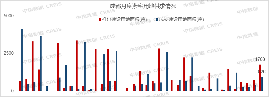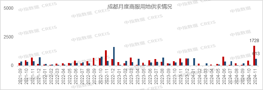 2024年11月,涉宅用地供应34宗,共计1763亩;成交20宗,共计926亩。除2宗分别位于锦江和高新地块溢价成交外,其余底价成交。1-11月累计供应133宗,合计6664亩;累计成交97宗,合计4805亩。