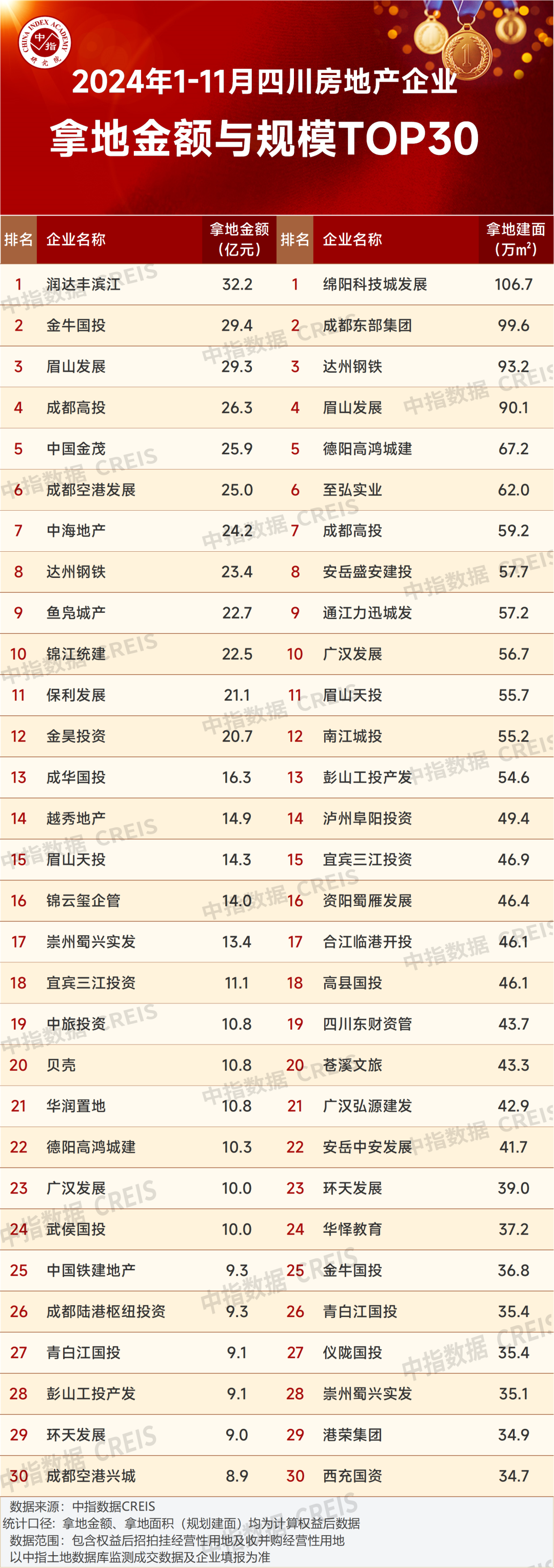 润达丰滨江以32.2亿元位列在蓉及在川拿地金额TOP1。成都东部集团以99.6万㎡位列在蓉拿地规模TOP1。