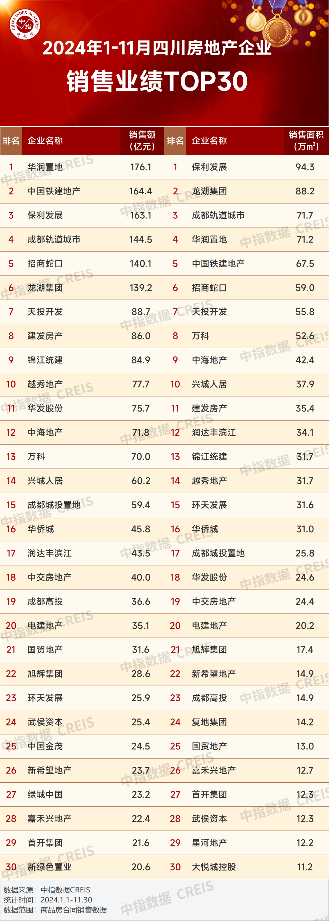 数据说明:房地产企业销售数据统计是以2024年1月1日-11月30日期间销售的商品房为统计口径,主要依据中指数据CREIS(点击查看)在成都的销售监测数据,并参考当期总体经营情况和推盘去化情况进行分析统计;对于少数没有在监测范围内的项目,由企业提供相关证明文件,经课题组对数据进行严格审核,也纳入统计范围。本报告仅供参考,课题组不对使用报告及其内容所引发的任何直接或间接损失承担责任。