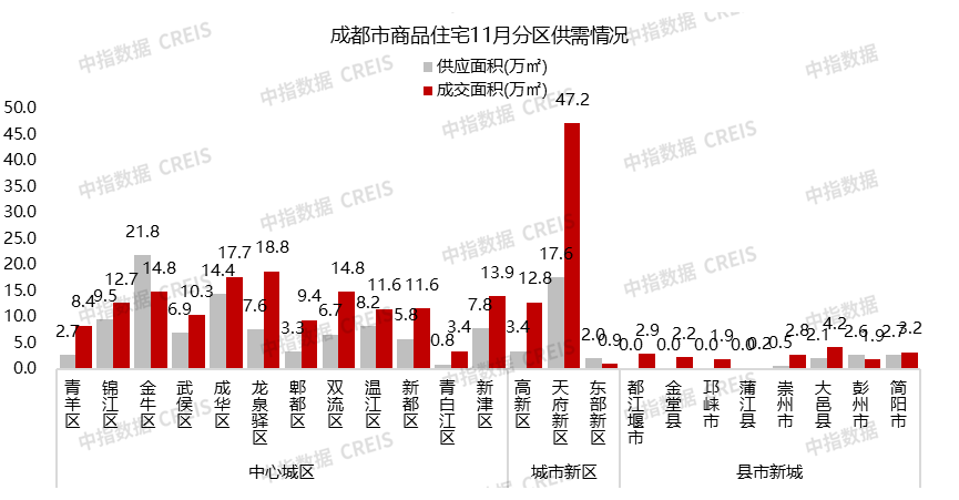 11月,金牛区商品住宅供应面积最高,为21.8万㎡,其次为天府新区的17.6万㎡;天府新区商品住宅成交面积最高,为47.2万㎡,其次为龙泉驿区的18.8万㎡。