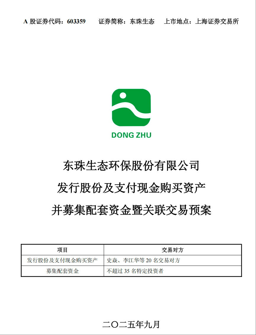 9月9日晚间,东珠生态(603359)发布预案称,上市公司拟通过发行股份及支付现金的方式向史焱、李江华等20名交易对方购买其合计持有的凯睿星通89.49%股份,并募集配套资金。