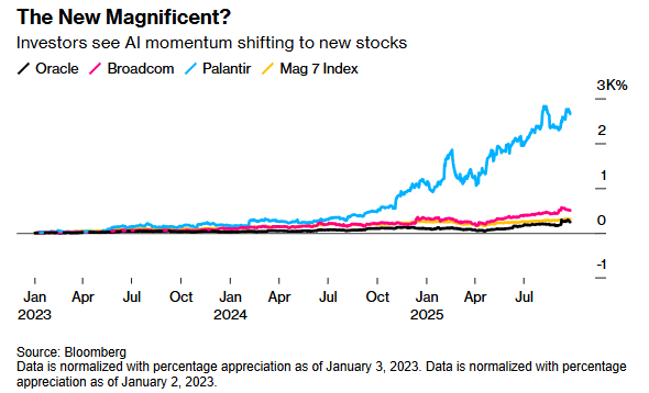 因此,基于科技七巨头的投资策略(自2023年初以来标普500指数超过70%的涨幅中,有超过一半是由它们贡献的),也错过了一些同样有望在AI未来中蓬勃发展的公司,例如博通公司、甲骨文公司和Palantir。