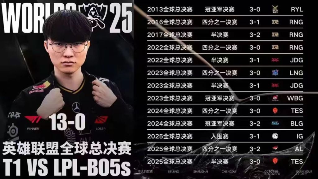 Faker率领T1在本届赛事中淘汰了三支LPL战队,历史上BO5对阵LPL保持13战全胜。