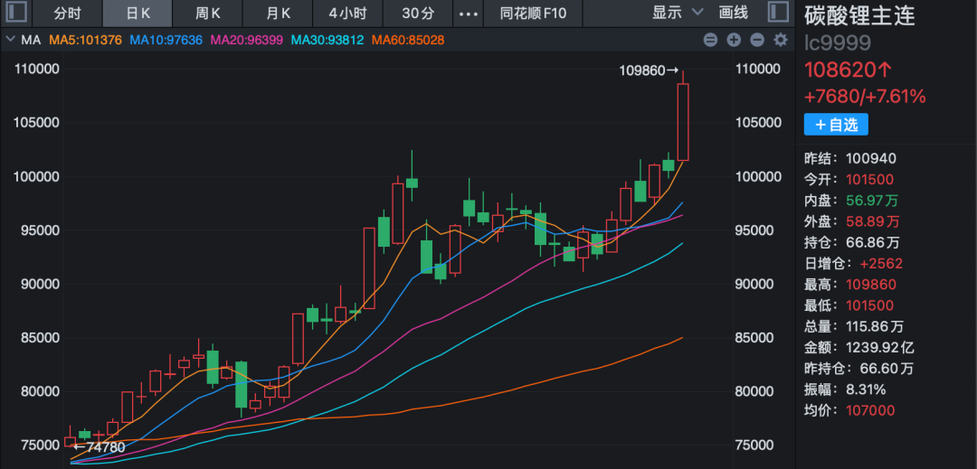 12月17日,国内期货市场碳酸锂主力合约2605大幅领涨,截至下午收盘报涨7.61%,盘中最高到达109860元/吨,逼近11万元大关,为近一年多高位。