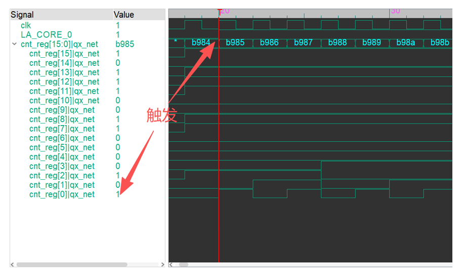 Operand 列:设置算数运算时,信号根据 Condition 比较的操作数数值。如图 4-4 中,设置 Counter 计数到 16’h0009 时触发,触发后波形如图 4-5 所示。