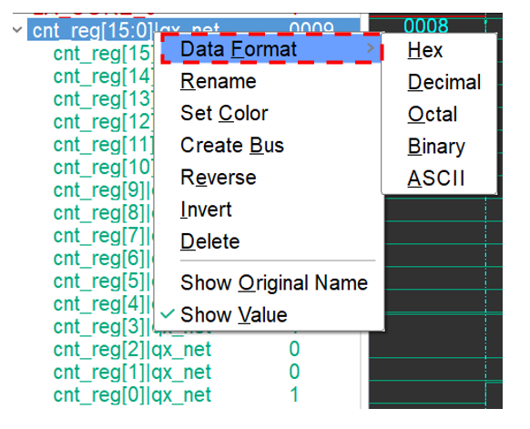 选择 bus 信号后,通过右键菜单 Data Format 设置当前选择的 bus 信号的显示数据格式,可选择 16 进制(Hex),十进制(Decimal),八进制(Octal),二进制(Binary)以及 ASCII 码,如图 5-5。