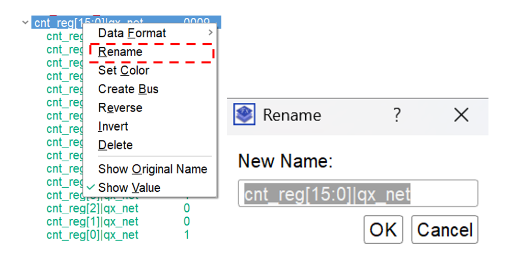 选择信号后,通过右键菜单 Rename,打开重命名窗口,输入新的信号名字即可,如图 5-3。