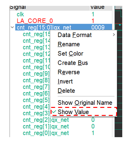通过勾选信号列表视图的右键菜单 Show Value,设置是否在信号列表视图中显示信号当前值,默认显示,如图 5-11。